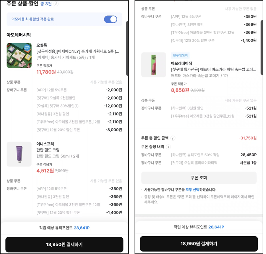 보통 공식몰 기본 쿠폰만 쓰시는데, 그러면 손해입니다. 외부 제휴처(T우주, 하나원큐) 쿠폰을 함께 사용하면 결제 금액은 1만 원대로 뚝 떨어지지만, 적립되는 뷰티포인트는 행사 기준에 따라 대폭 지급됩니다.
